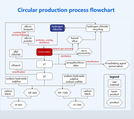 The company has become the first company in the industry to complete the closed cycle of silane production chain through technical transformation. It has formed a complete industrial chain layout from silicon, the basic raw material, to intermediates such as trichlorosilane, γ1, γ2, and then to sulfur-containing silane, which realizes the effective control of product quality and cost. As for silicon tetrachloride, the by-product generated in the production process, the company will process it into fumed silica and sell it to the public; the by-product hydrogen chloride has also been recycled. Through the closed cycle of silane production chain, the company not only eliminates the need of hydrogen and chlorine purchasing, improves the efficiency of material use, but also reduces the emission of "three wastes" in the process of production, and realizes better economic and environmental benefits.
